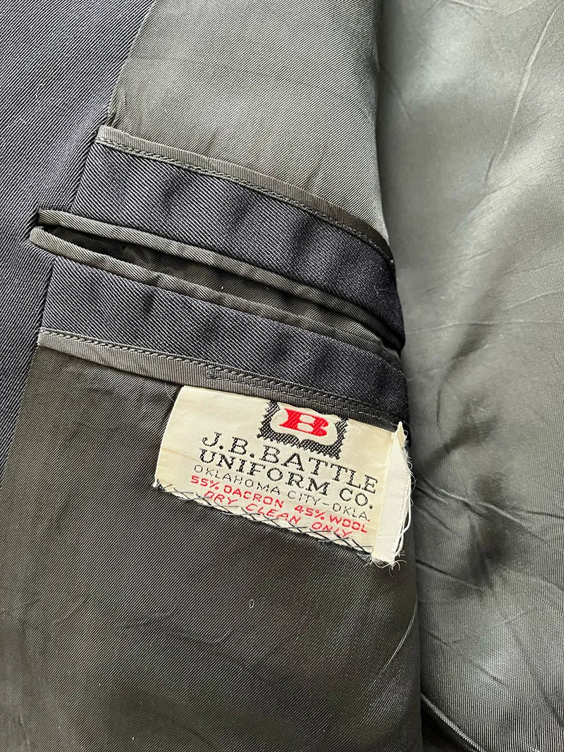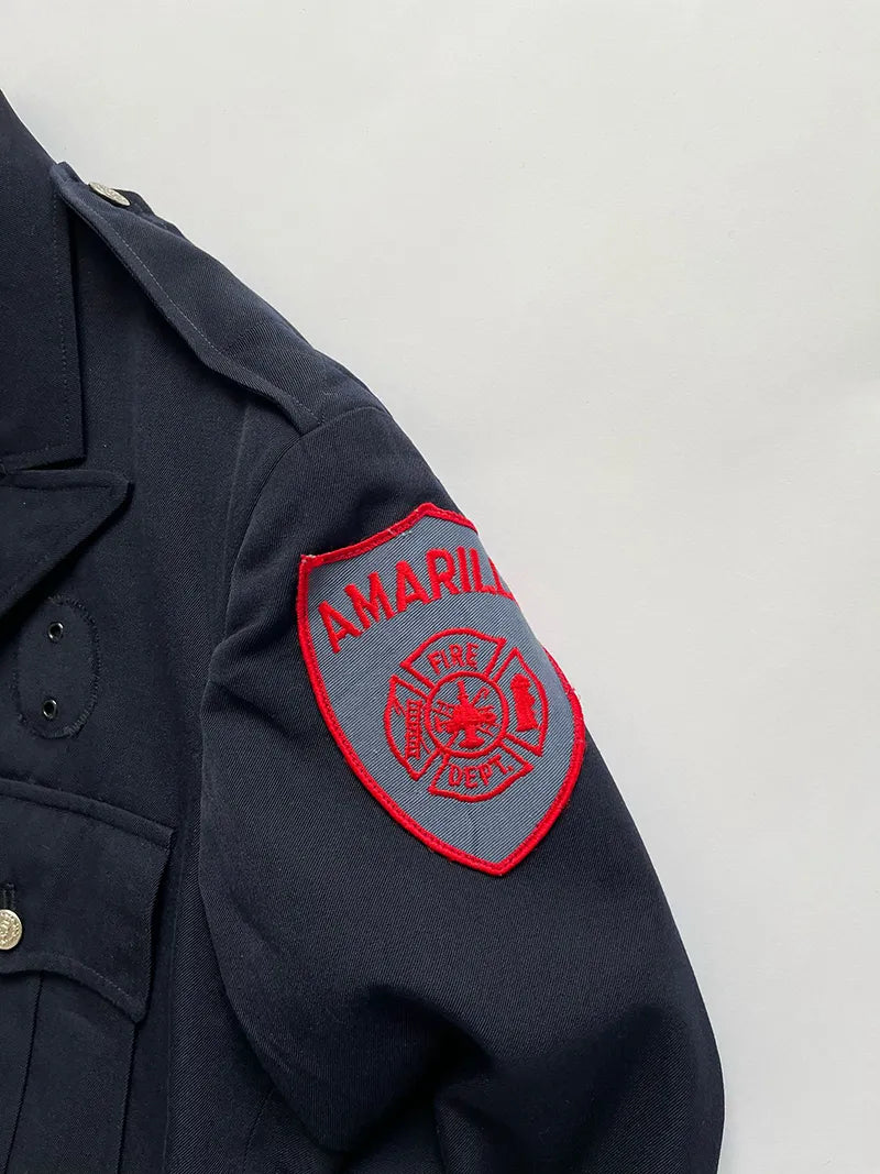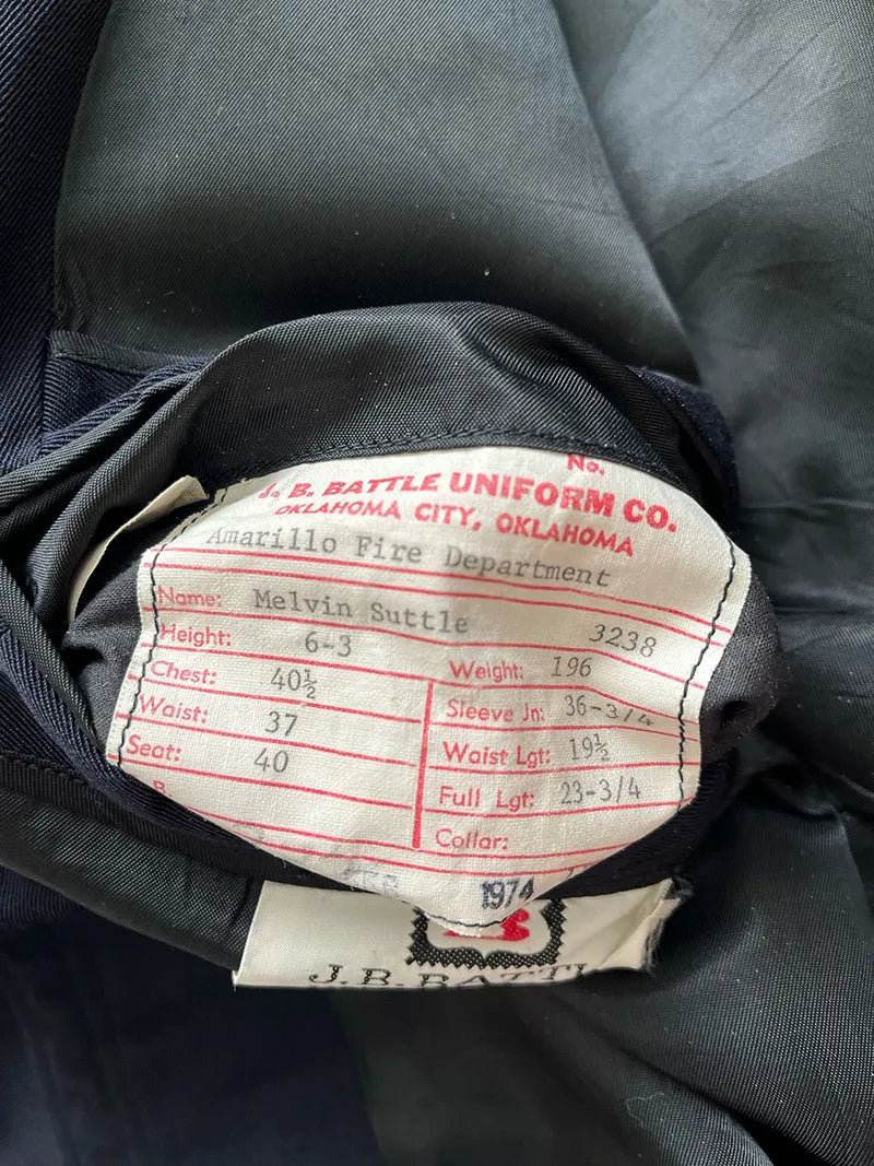 JB Battle Uniform Jacket used by the Amarillo Fire Department, located in the state of Texas, USA. The jacket is dated 1974, along with all the information regarding the previous user.