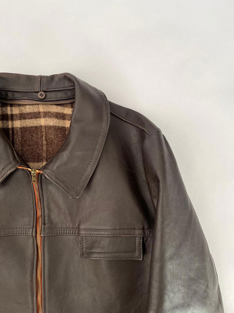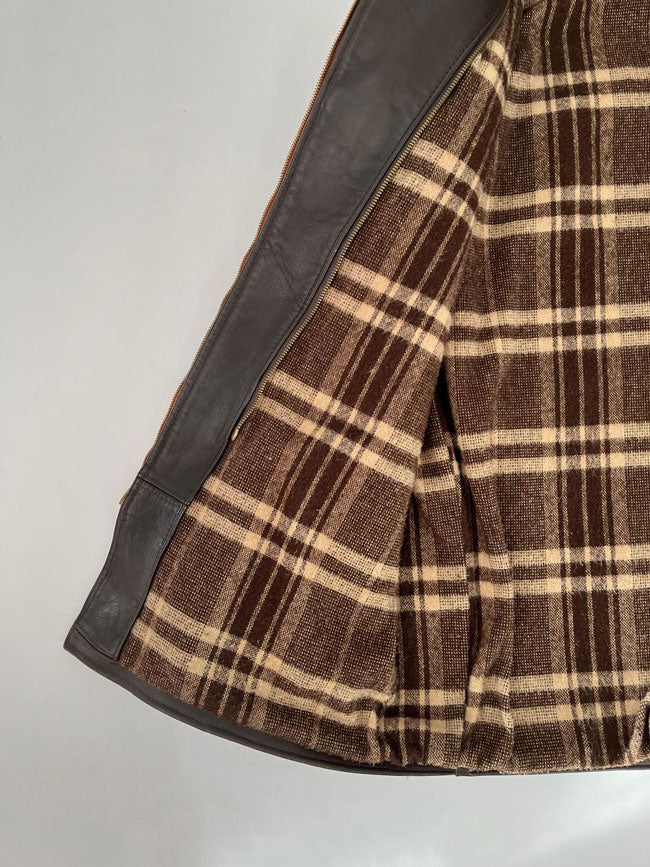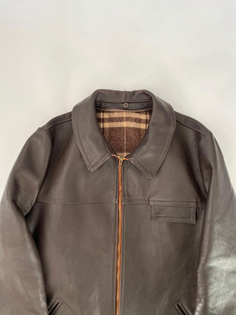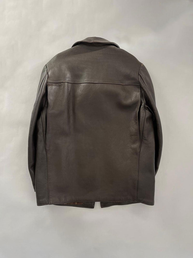 Brown leather French jacket/coat, produced approximately in the 1960s by the French brand GVF, featuring a long, sturdy design, completed with an Eclair zip.