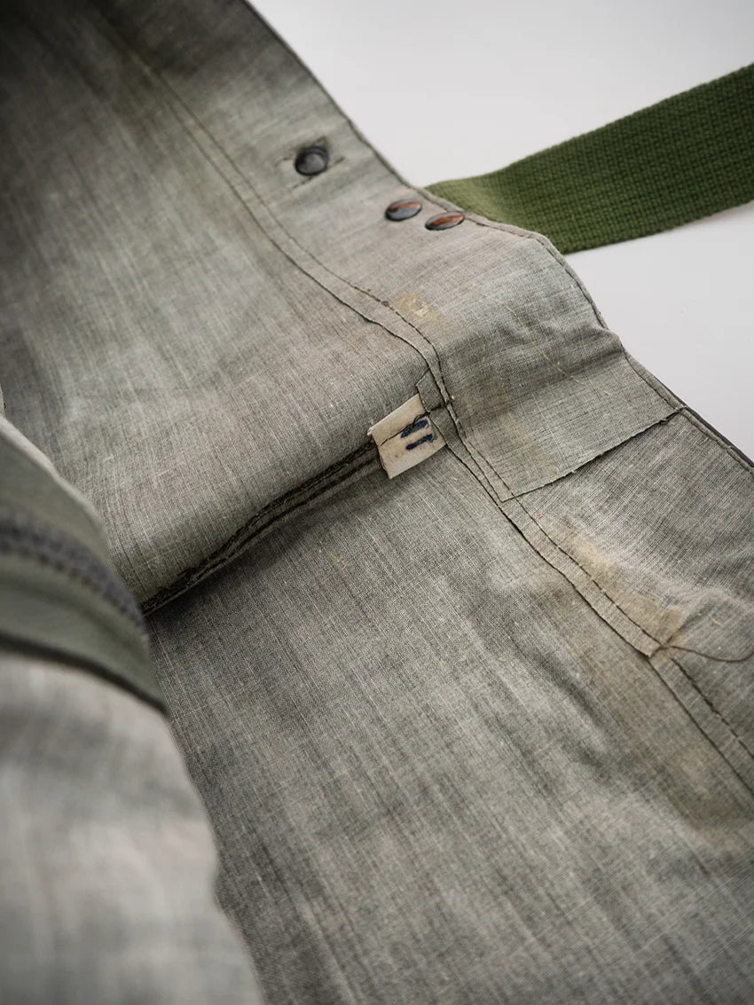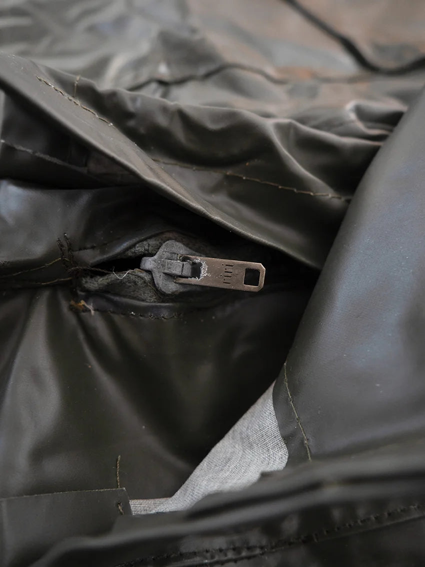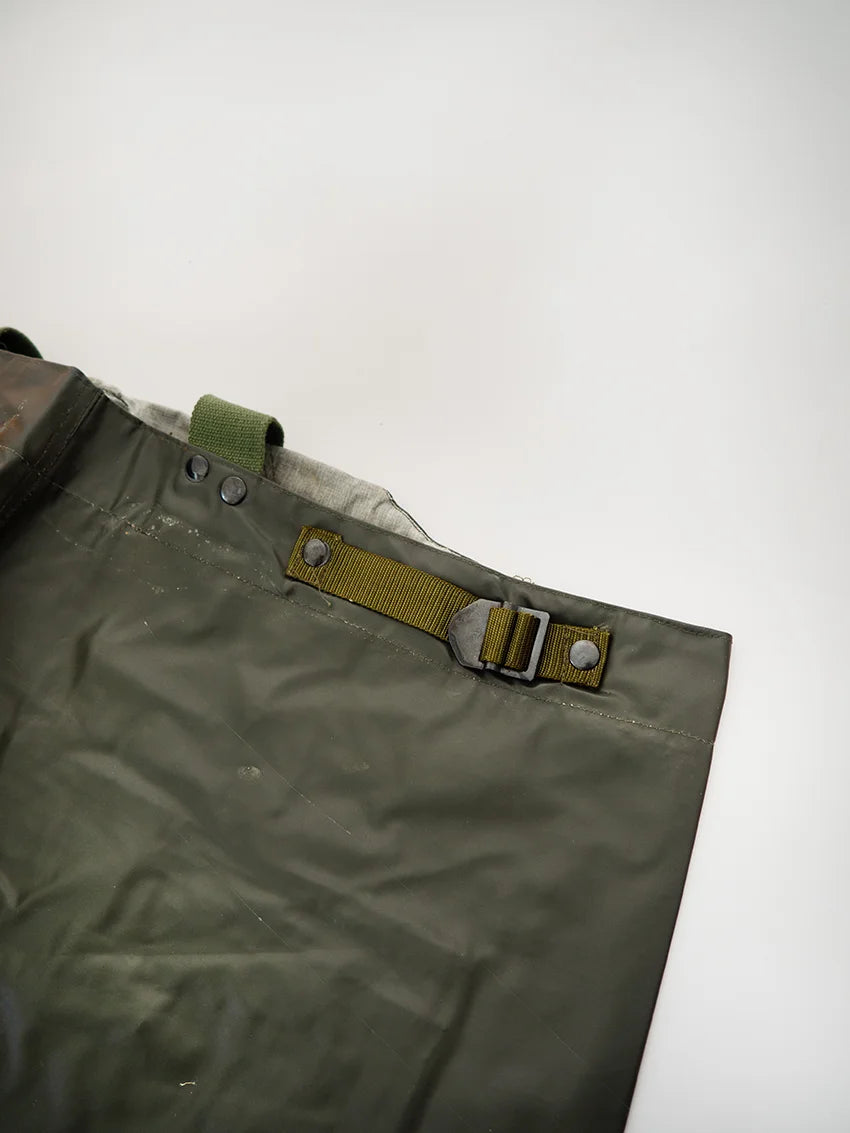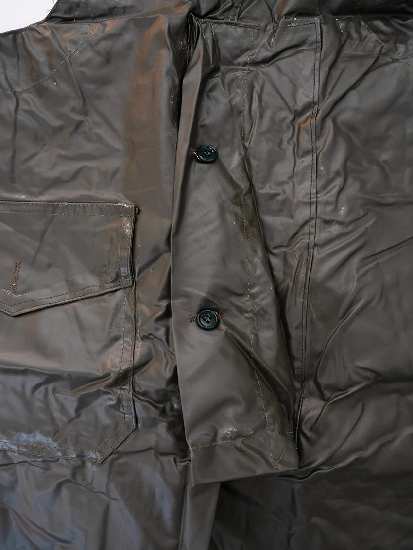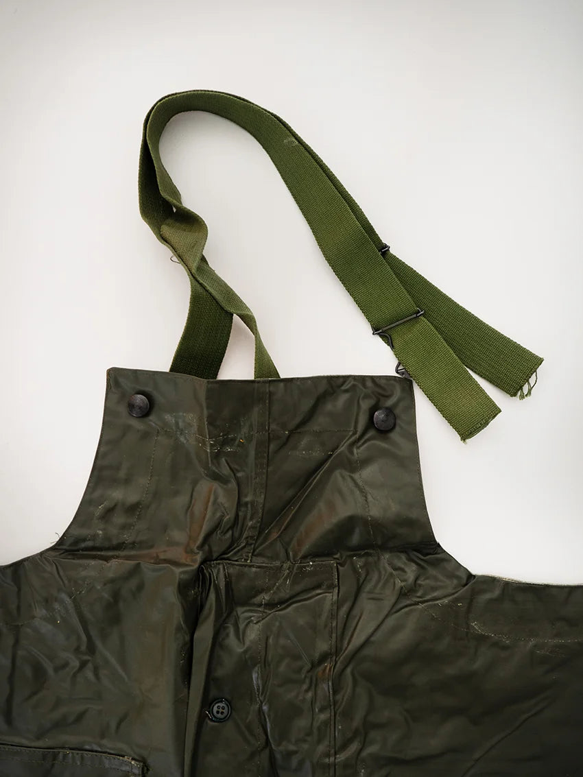 Italian Navy rain pants, dating back to the 1980s/1990s. Made of fully waxed canvas, they are designed to offer maximum rain protection in harsh operating conditions. Most likely used for deck operations, they feature a functional and durable construction. The interior is lined with cotton for added comfort.