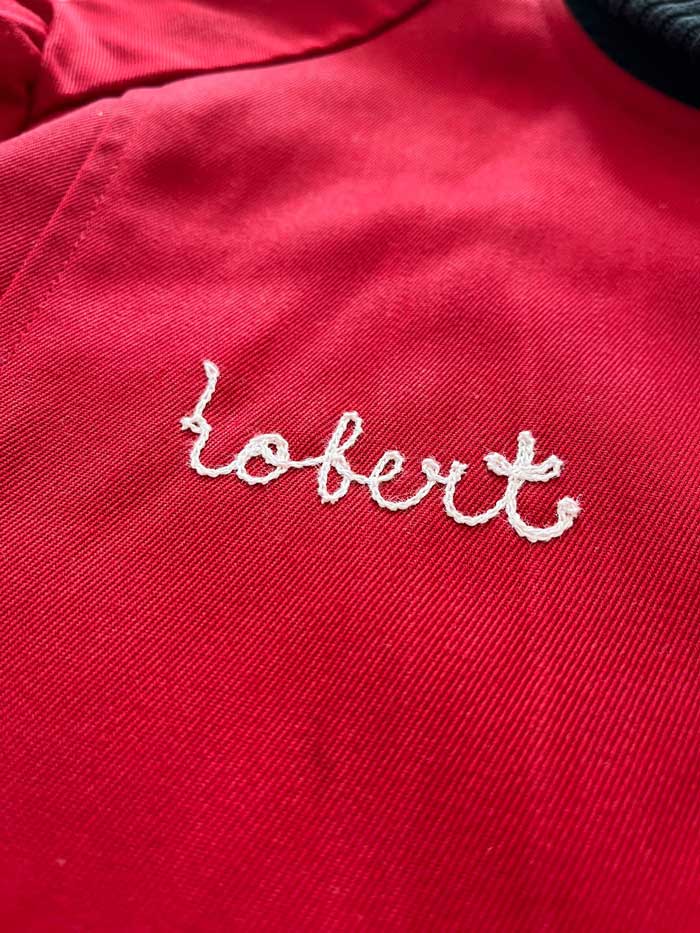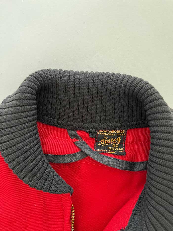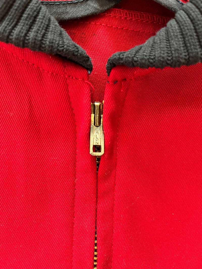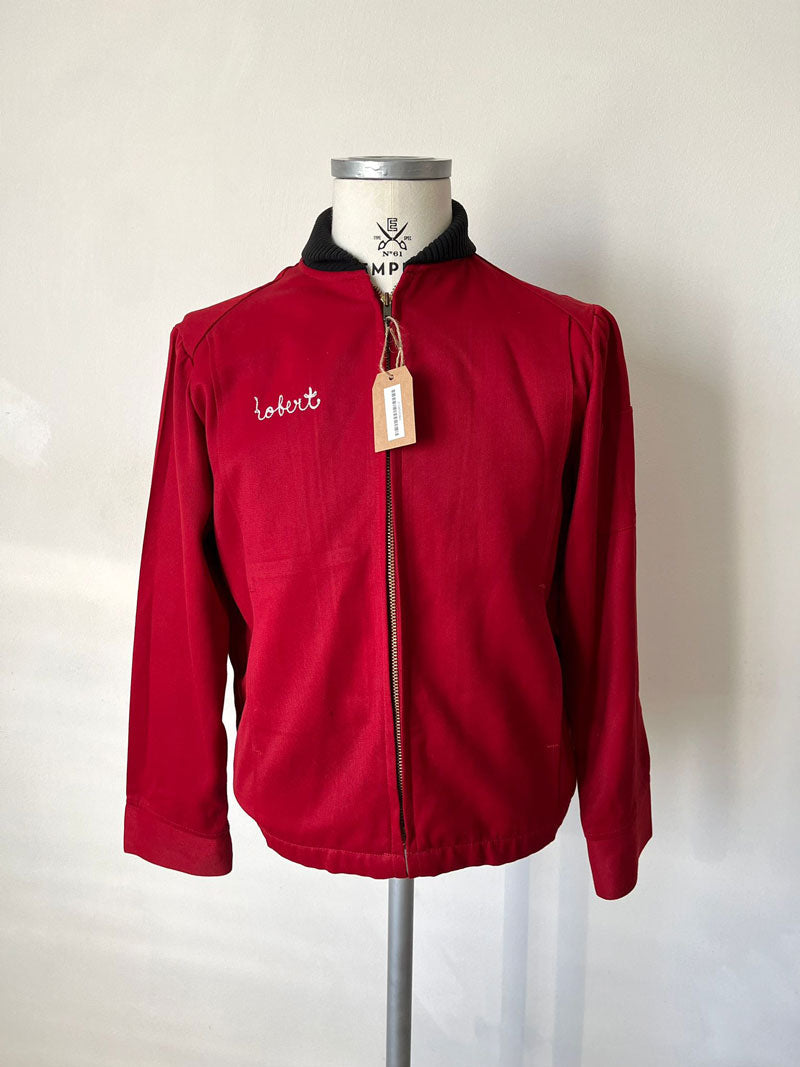 Vintage 70s red Unitog work jacket with talon zip and "Robert" embroidery.