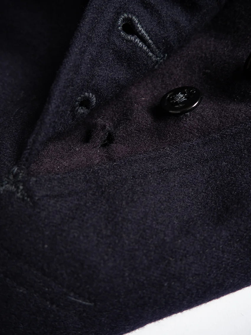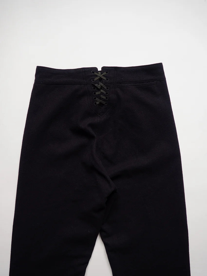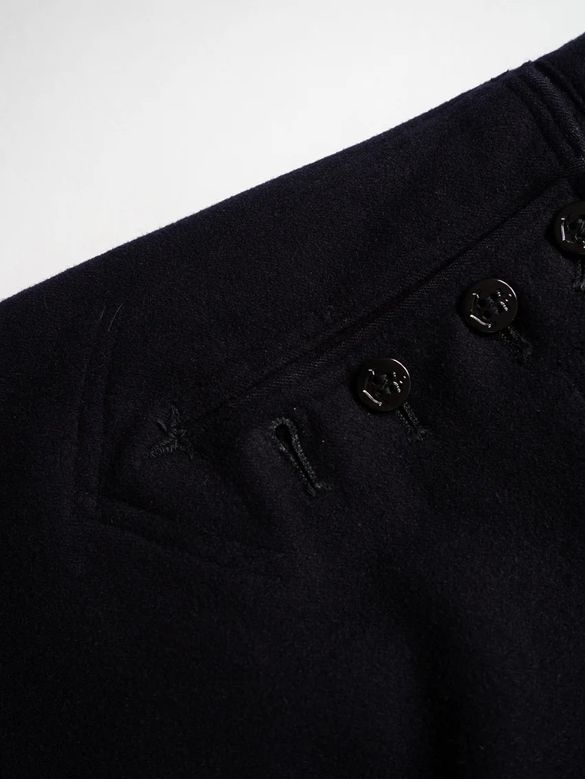 Cracker jack pants della U.S. Navy anni 60. Sono i tradizionali pantaloni da marinaio con fondo a campana e pattina frontale a 13 bottoni, parte dell’uniforme arruolata fin dal XIX secolo. Nati per esigenze pratiche di bordo (libertà di movimento, facilità nel rimboccare le gambe), sono diventati nel tempo un simbolo iconico del marinaio americano. Il nome Crackerjack deriva dall’immaginario popolare legato alla famosa confezione di snack con il marinaio in uniforme.