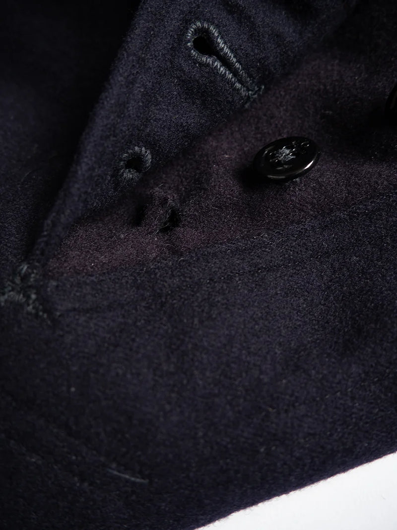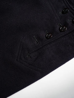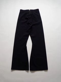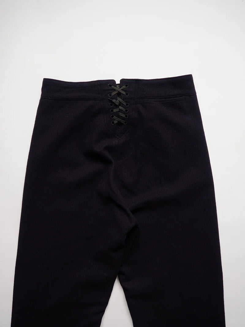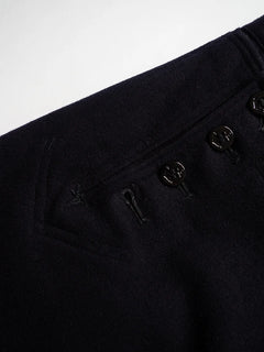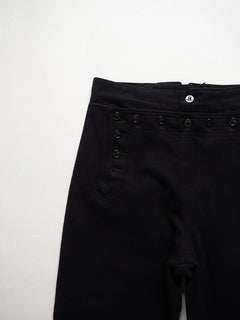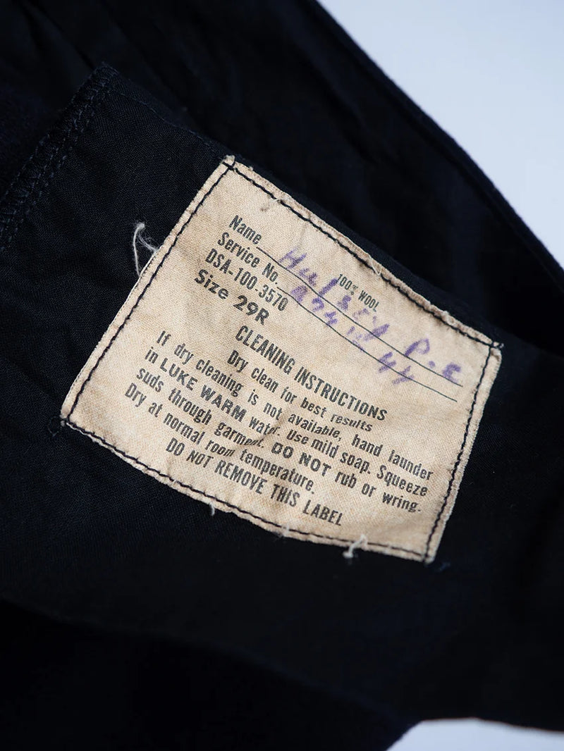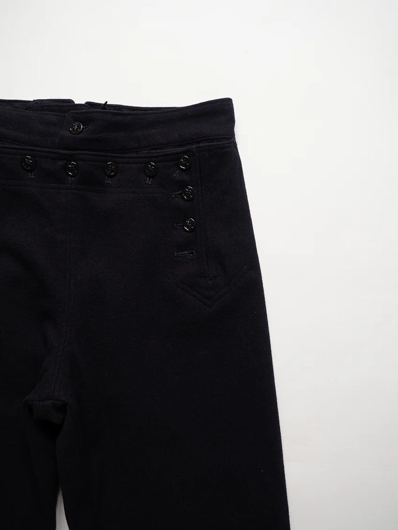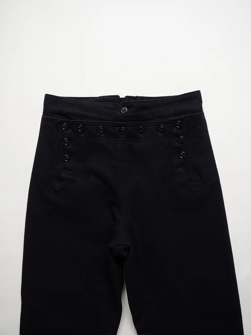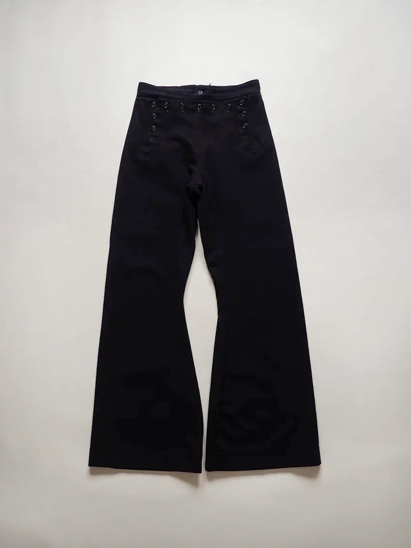 Pantalon Crackerjack de l'US Navy des années 1960. Ce pantalon de marin traditionnel, à pattes d'éléphant et patte de boutonnage à 13 boutons, fait partie de l'uniforme des engagés depuis le XIXe siècle. Conçu pour répondre aux besoins pratiques à bord des navires (liberté de mouvement, facilité de retroussement des jambes), il est devenu au fil du temps un symbole emblématique du marin américain. Le nom « Crackerjack » provient de l'image populaire associée à la célèbre boîte de biscuits représentant un marin en uniforme.