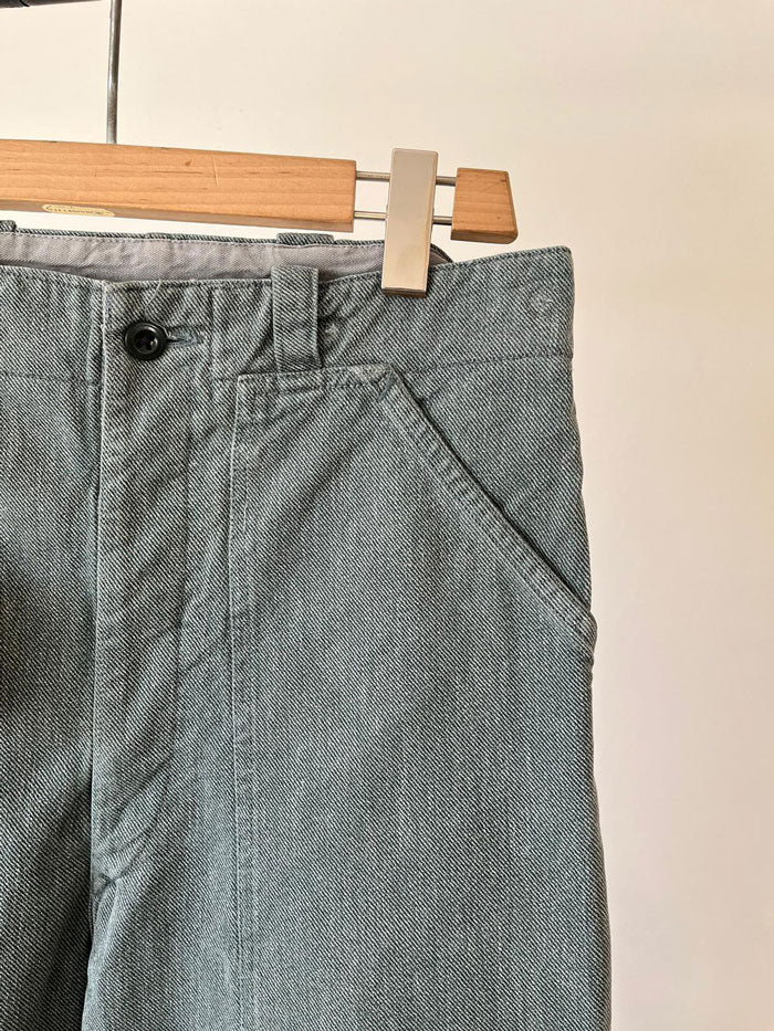 Couleur allant du gris au verdâtre, réalisé dans un tissu denim épais et de qualité.