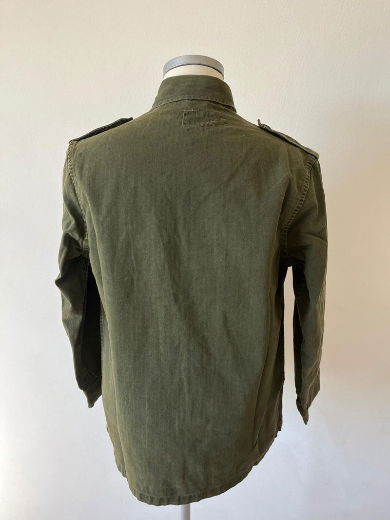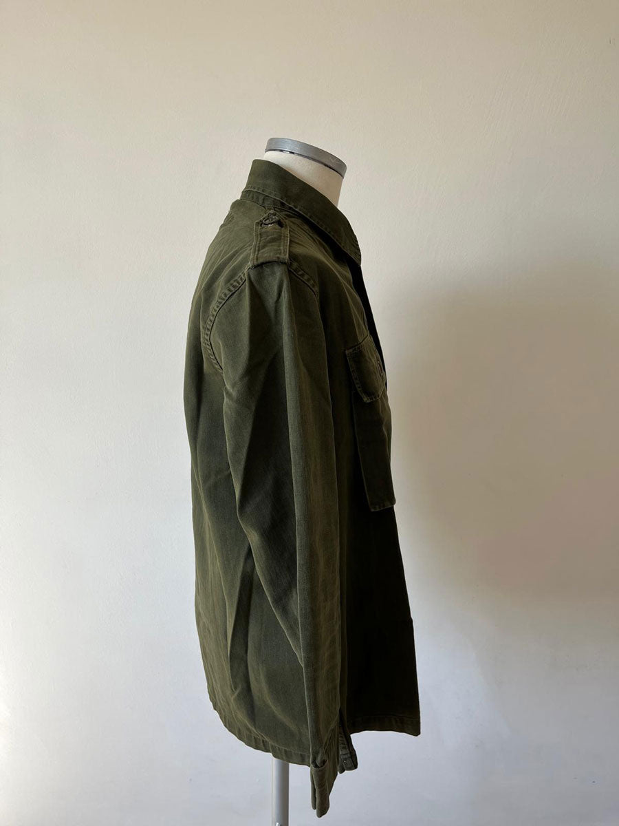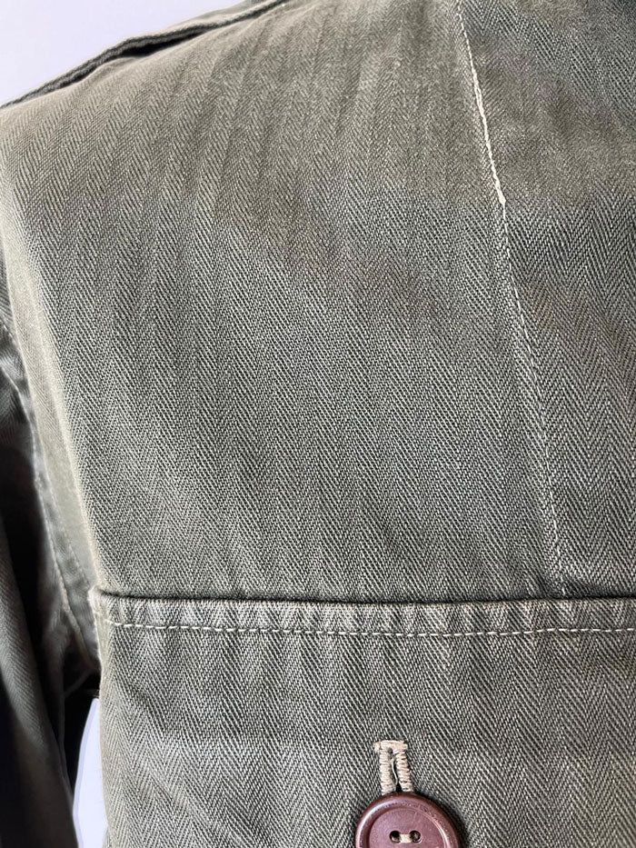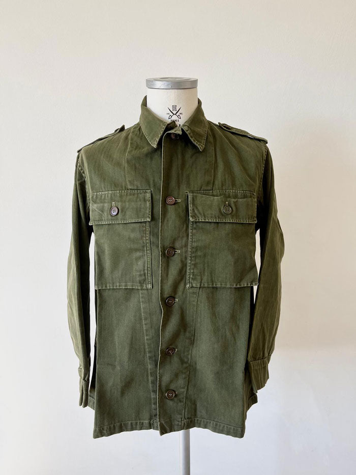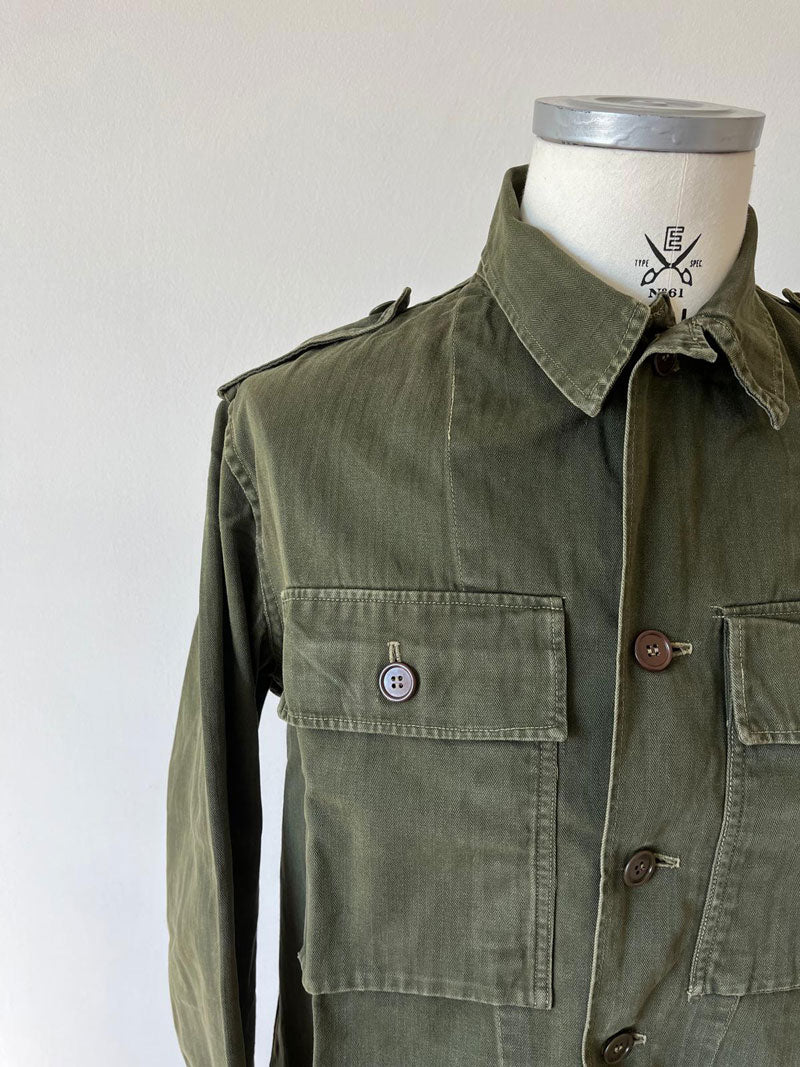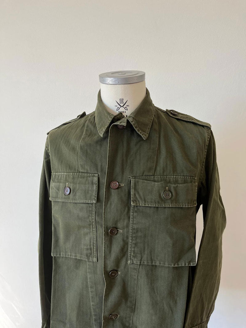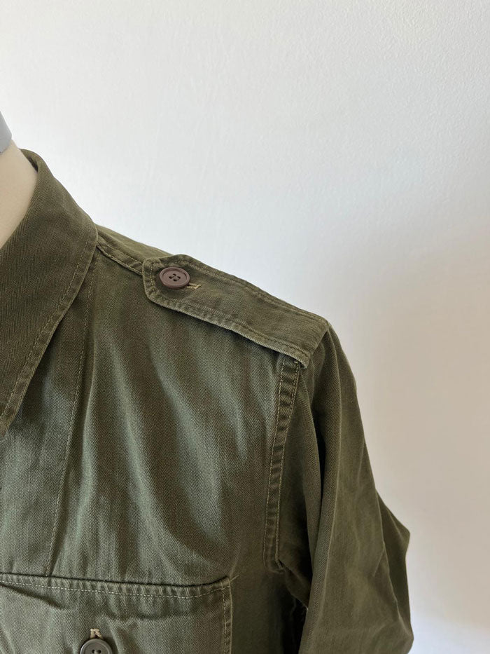 Dutch Army uniform shirt in cotone herringbone twill. Prodotta negli anni 60. Costruzione abbastanza squadrata con spalline e due tasche sul davanti.
