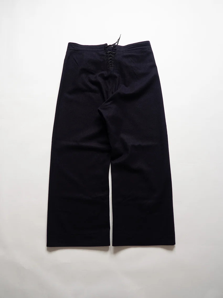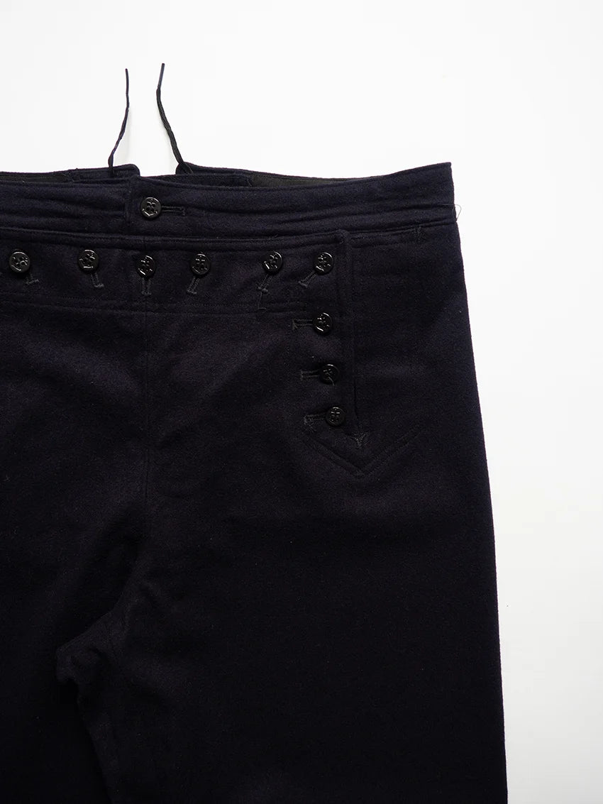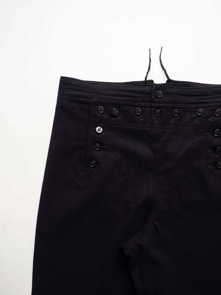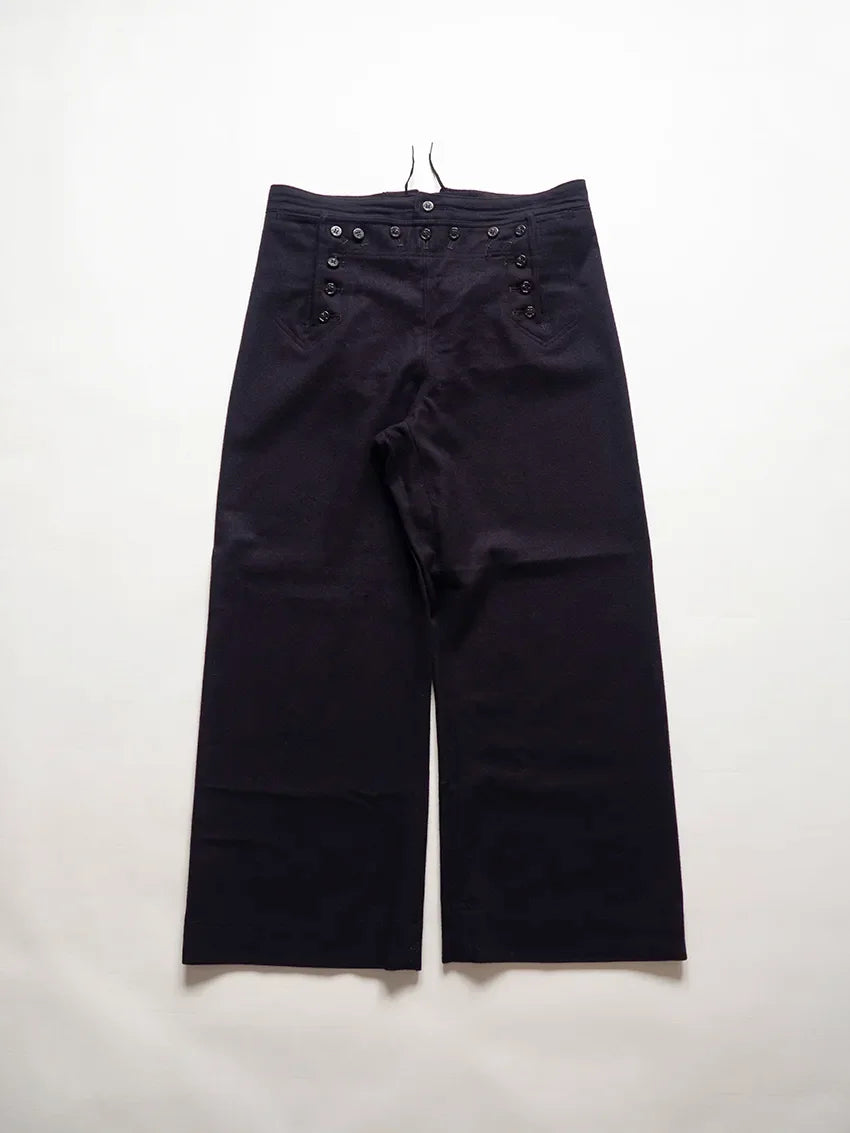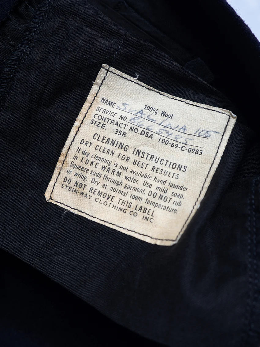 Cracker jack pants della U.S. Navy anni 60. Sono i tradizionali pantaloni da marinaio con fondo a campana e pattina frontale a 13 bottoni, parte dell’uniforme arruolata fin dal XIX secolo. Nati per esigenze pratiche di bordo (libertà di movimento, facilità nel rimboccare le gambe), sono diventati nel tempo un simbolo iconico del marinaio americano. Il nome Crackerjack deriva dall’immaginario popolare legato alla famosa confezione di snack con il marinaio in uniforme.