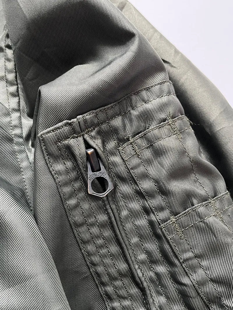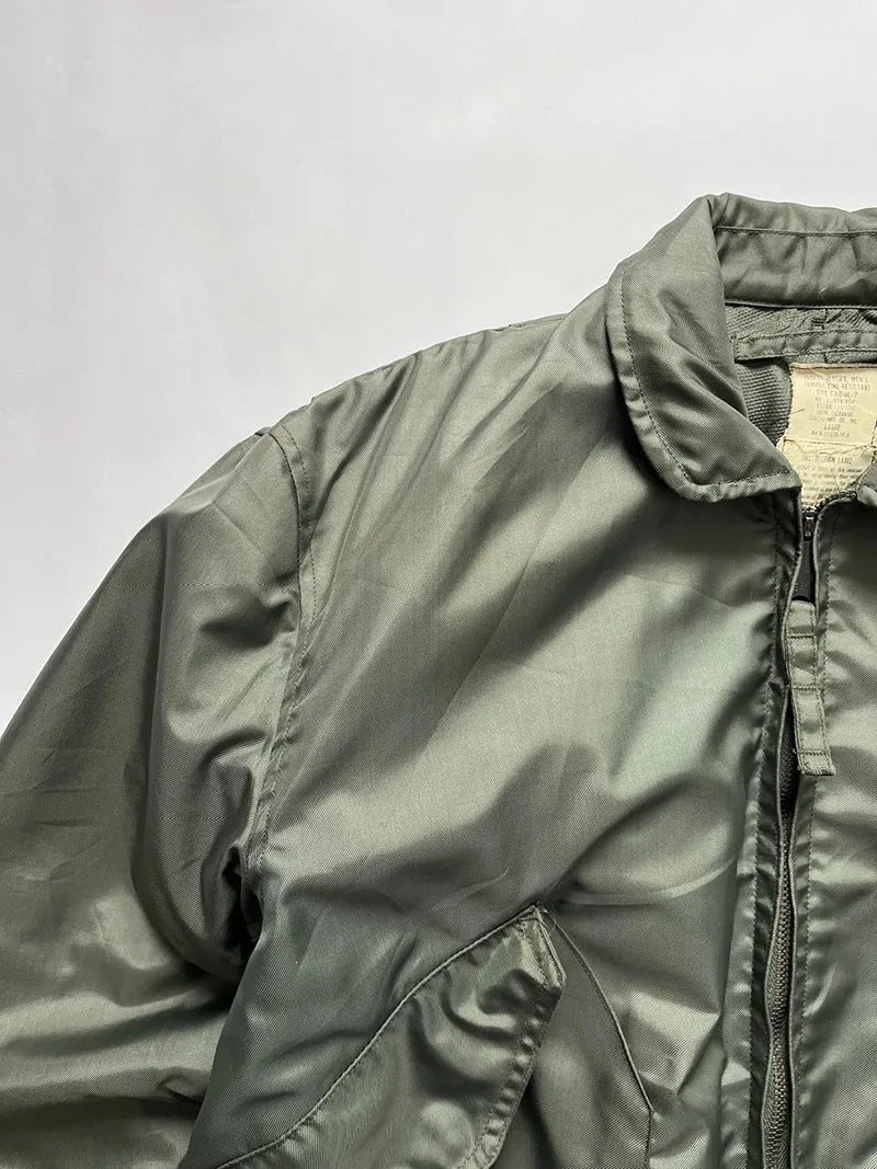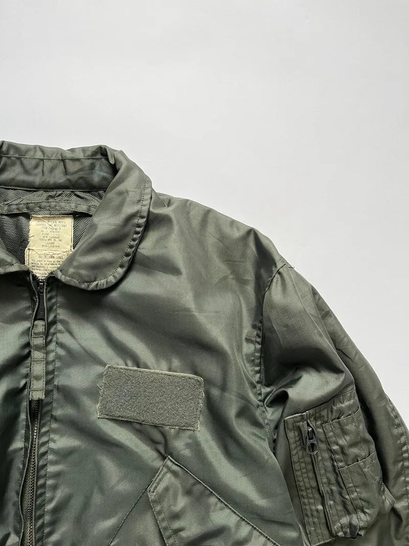 Rara giacca da pilota CWU-36/P del primo modello, caratterizzata dal pannello posteriore plissettato. Questo dettaglio fu rapidamente eliminato nelle versioni successive dopo che causò la morte di un pilota. Le giacche precedenti con il pannello pieghettato venivano generalmente scartate, oppure i piloti le facevano modificare da rigger per prevenire incidenti simili. Questo esemplare, invece, conserva intatte le pieghe originali, mantenendo le sue condizioni originali.