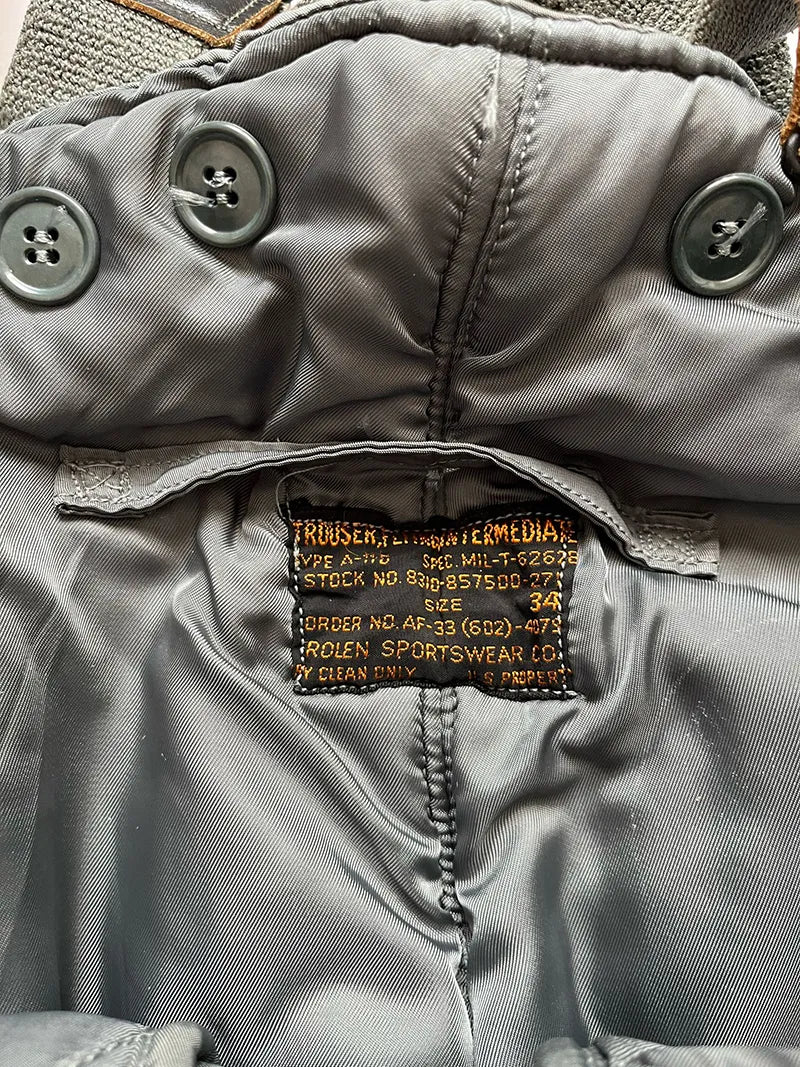 Pantaloni da volo originali USAF A-11D, datati indicativamente anni 70. Rolen Sportswear.