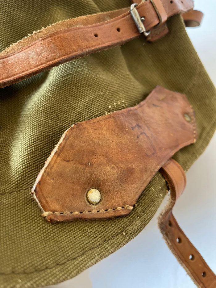 Zaino militare vintage Forțele Armate Române. Realizzato in tela e pelle, prodotto dagli anni 70 agli anni 80.
