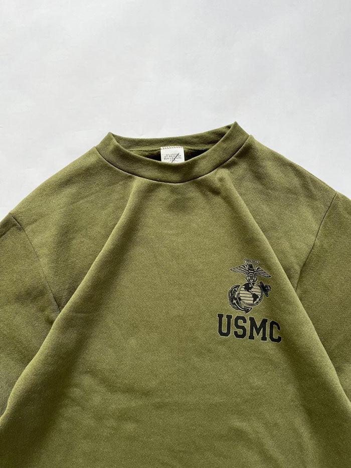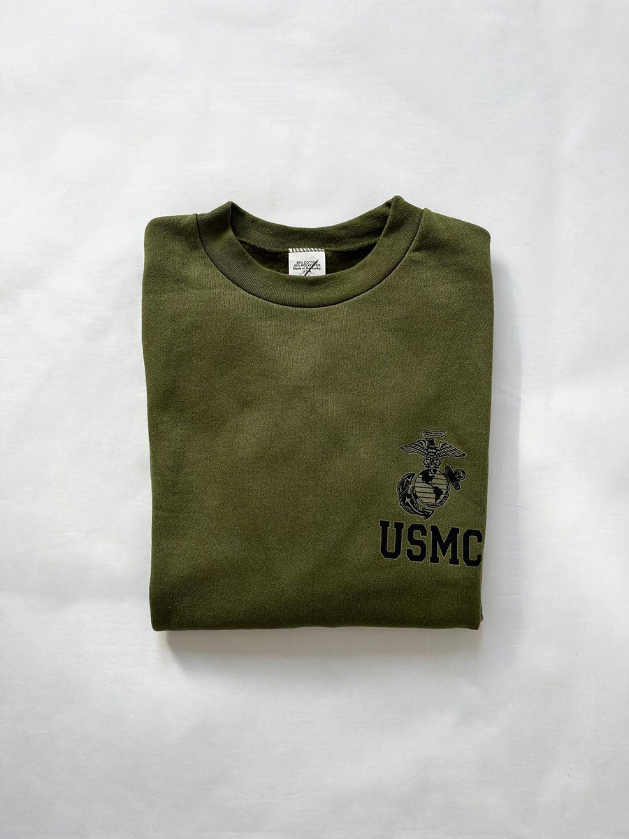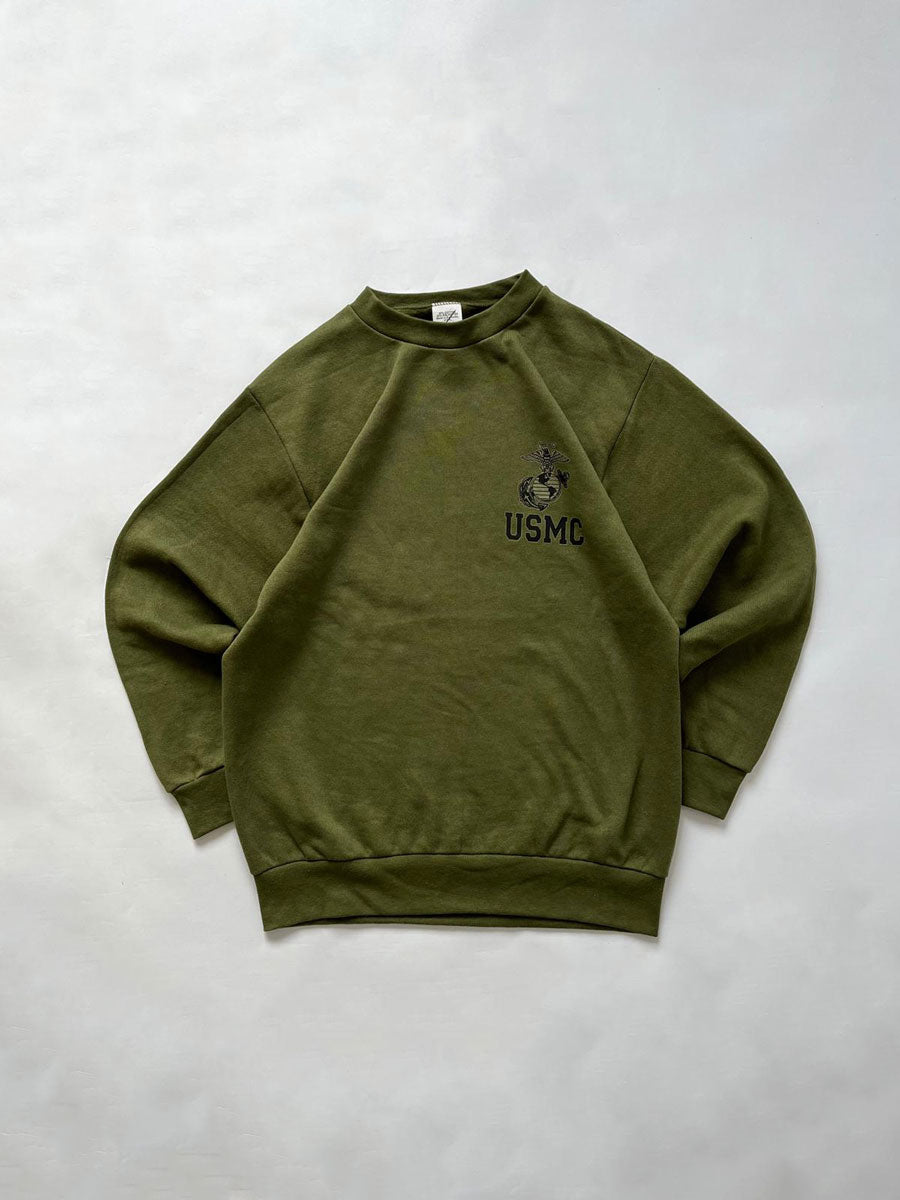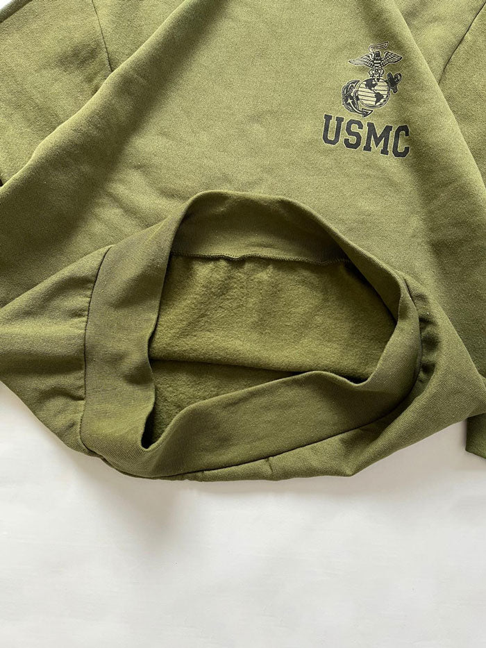 Sweatshirt utilizzata dalla US Marine Corps - USMC. Colore verde militare, produzione anni 90. Cotone e poliestere. Le condizioni sono deadstock. Nata come sweatshirt da allenamento.