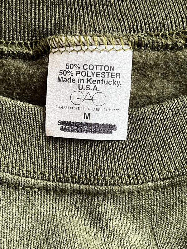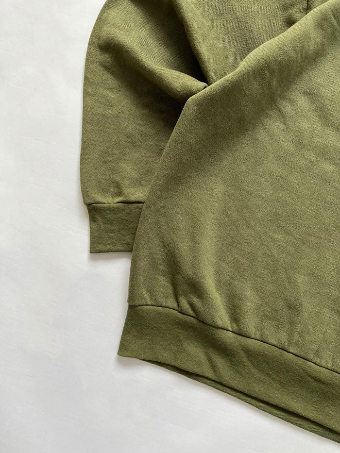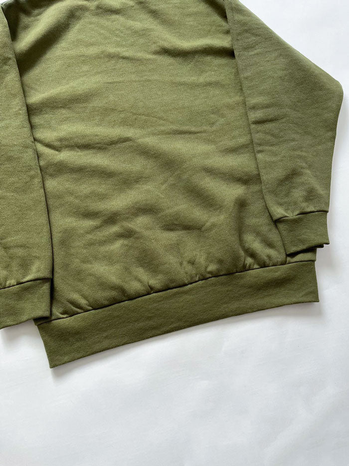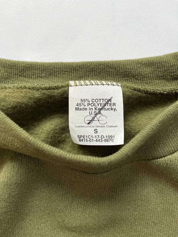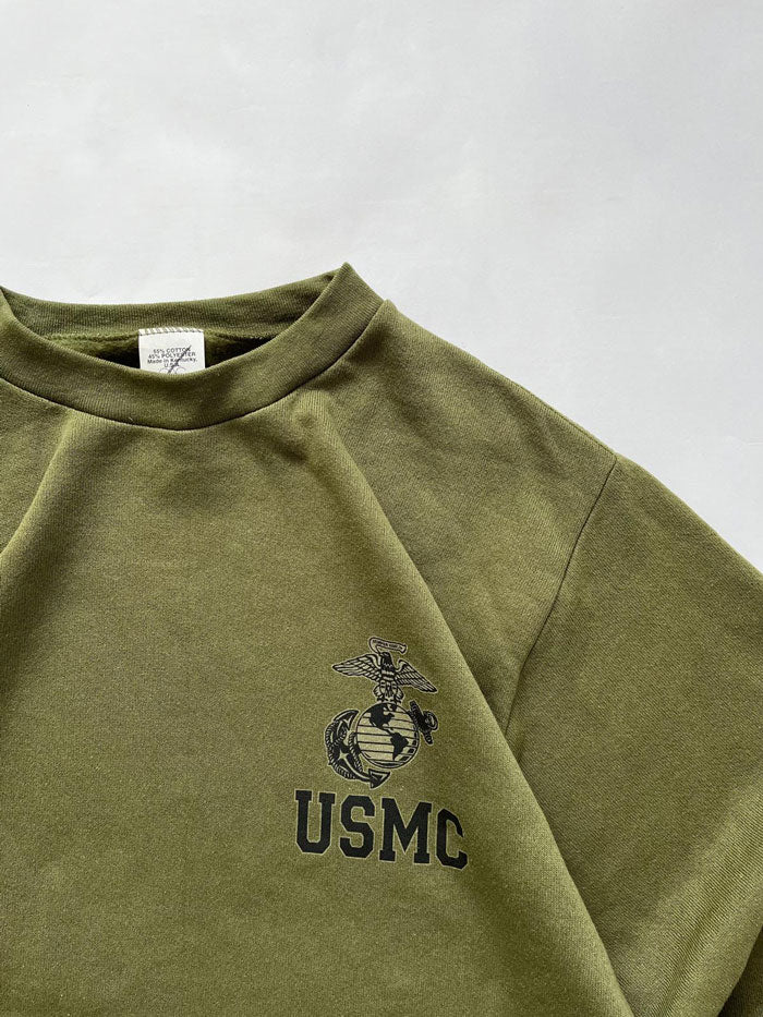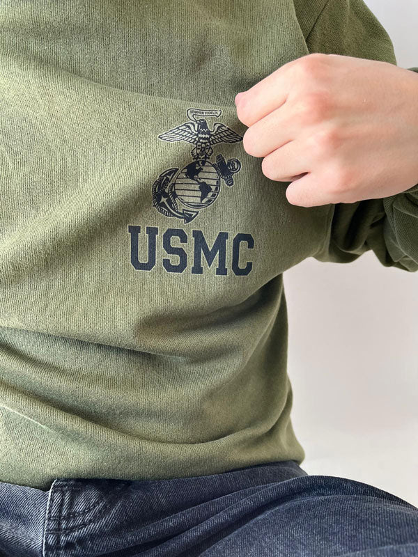 Sweatshirt utilizzata dalla US Marine Corps - USMC. Colore verde militare, produzione anni 90. Cotone e poliestere. Le condizioni sono deadstock. Nata come sweatshirt da allenamento.
