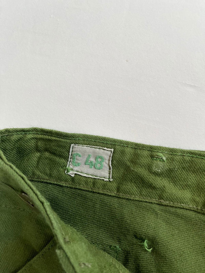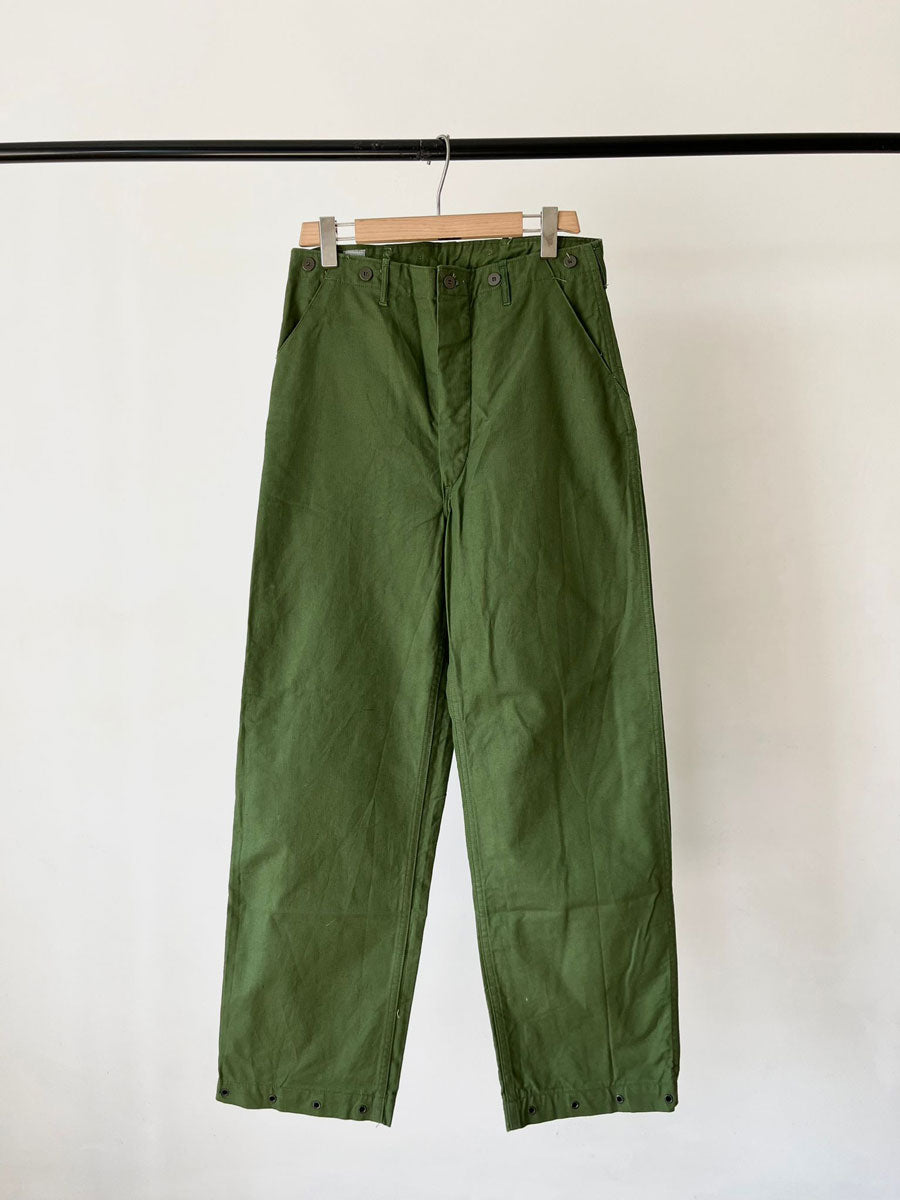 Fabbricati in tutto il paese e spesso in piccole fabbriche, questi pantaloni da lavoro presentavano un tessuto in twill di cotone resistente con un fit a vita alta e ampio sul fondo.