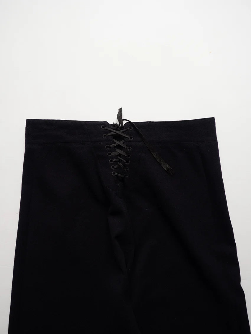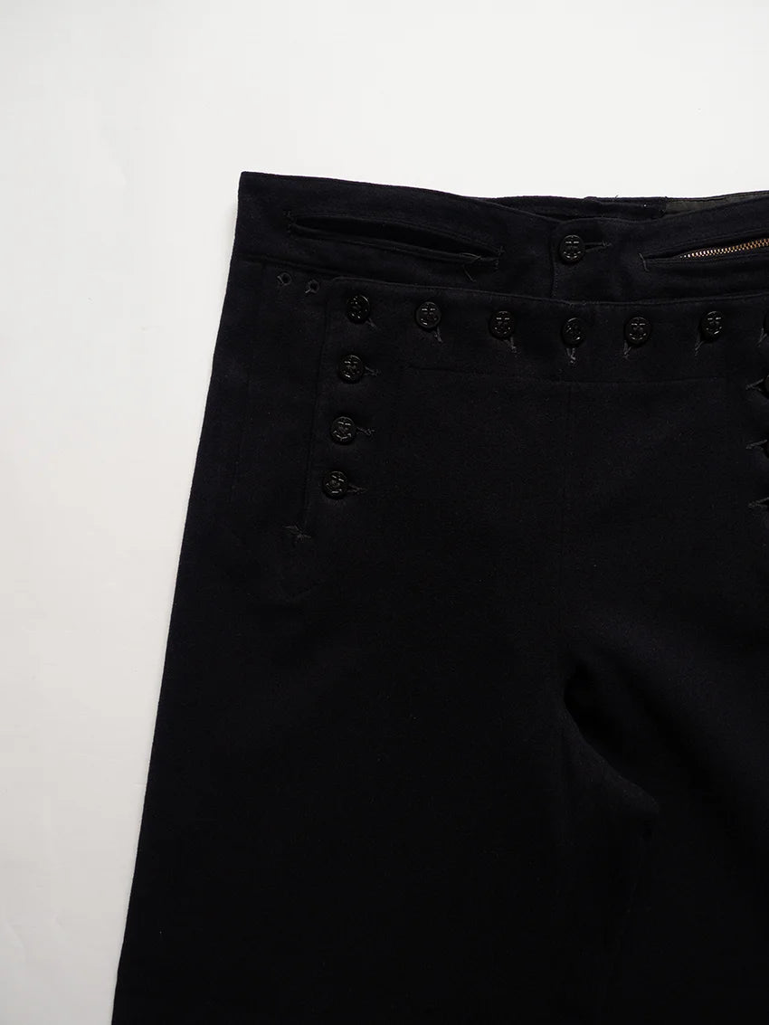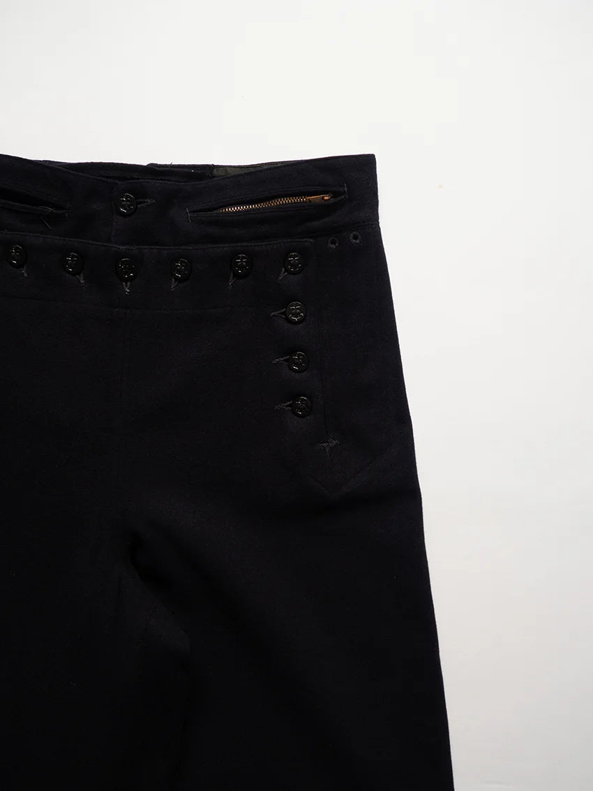 Cracker jack pants della U.S. Navy anni 40 risalenti al periodo della WW2. Sono i tradizionali pantaloni da marinaio con fondo a campana e pattina frontale a 13 bottoni, parte dell’uniforme arruolata fin dal XIX secolo. Nati per esigenze pratiche di bordo (libertà di movimento, facilità nel rimboccare le gambe), sono diventati nel tempo un simbolo iconico del marinaio americano. Il nome Crackerjack deriva dall’immaginario popolare legato alla famosa confezione di snack con il marinaio in uniforme.